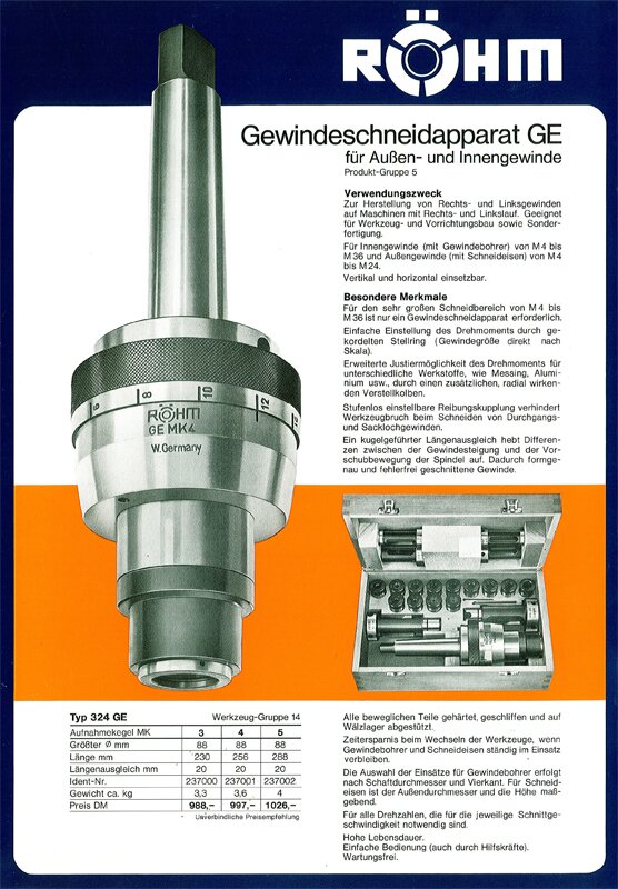 Das erste eigene Produkt, ein Gewindeschneidapparat, wird entwickelt und patentiert. Der Vertrieb erfolgt über die Firma Röhm.
